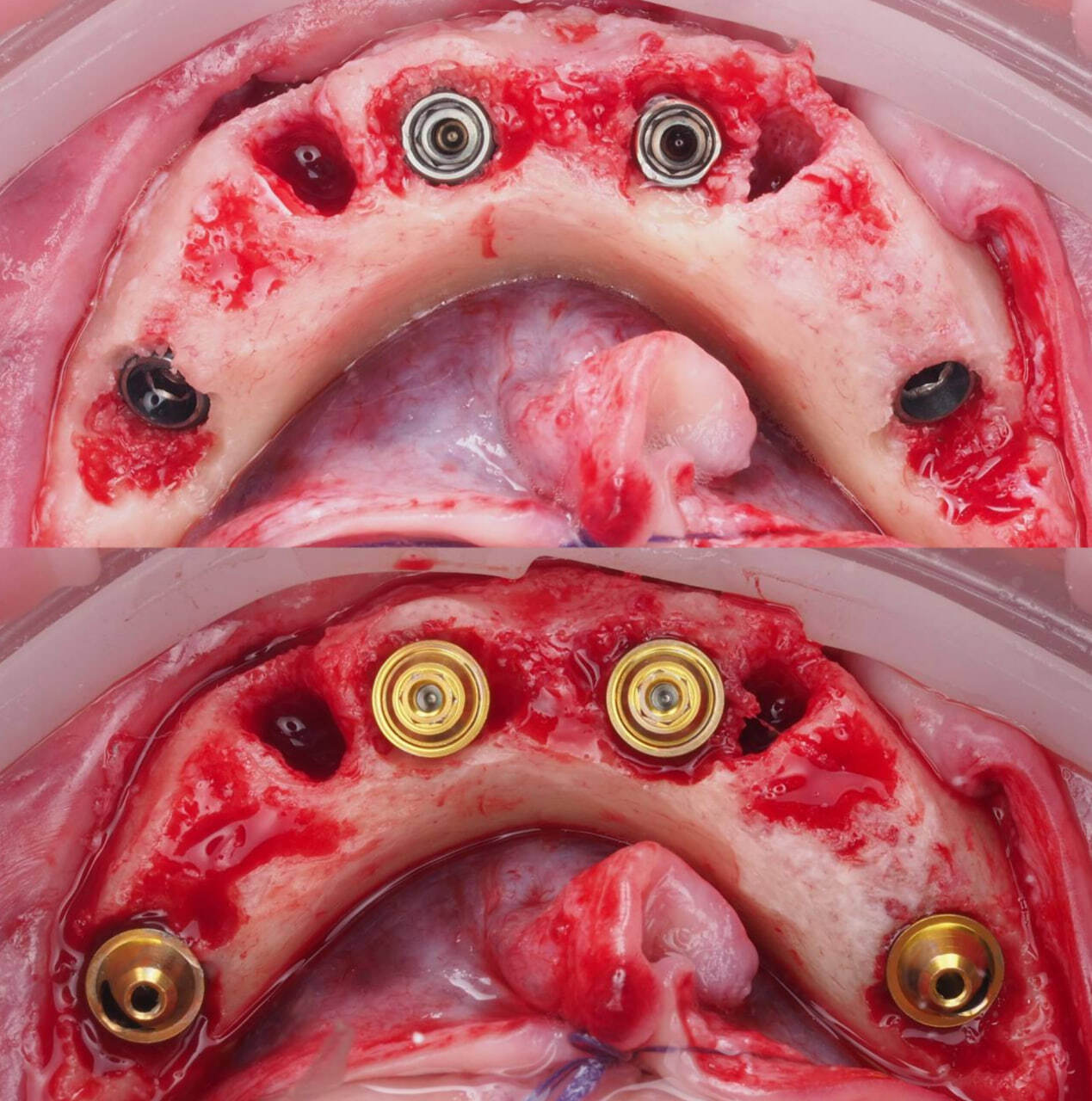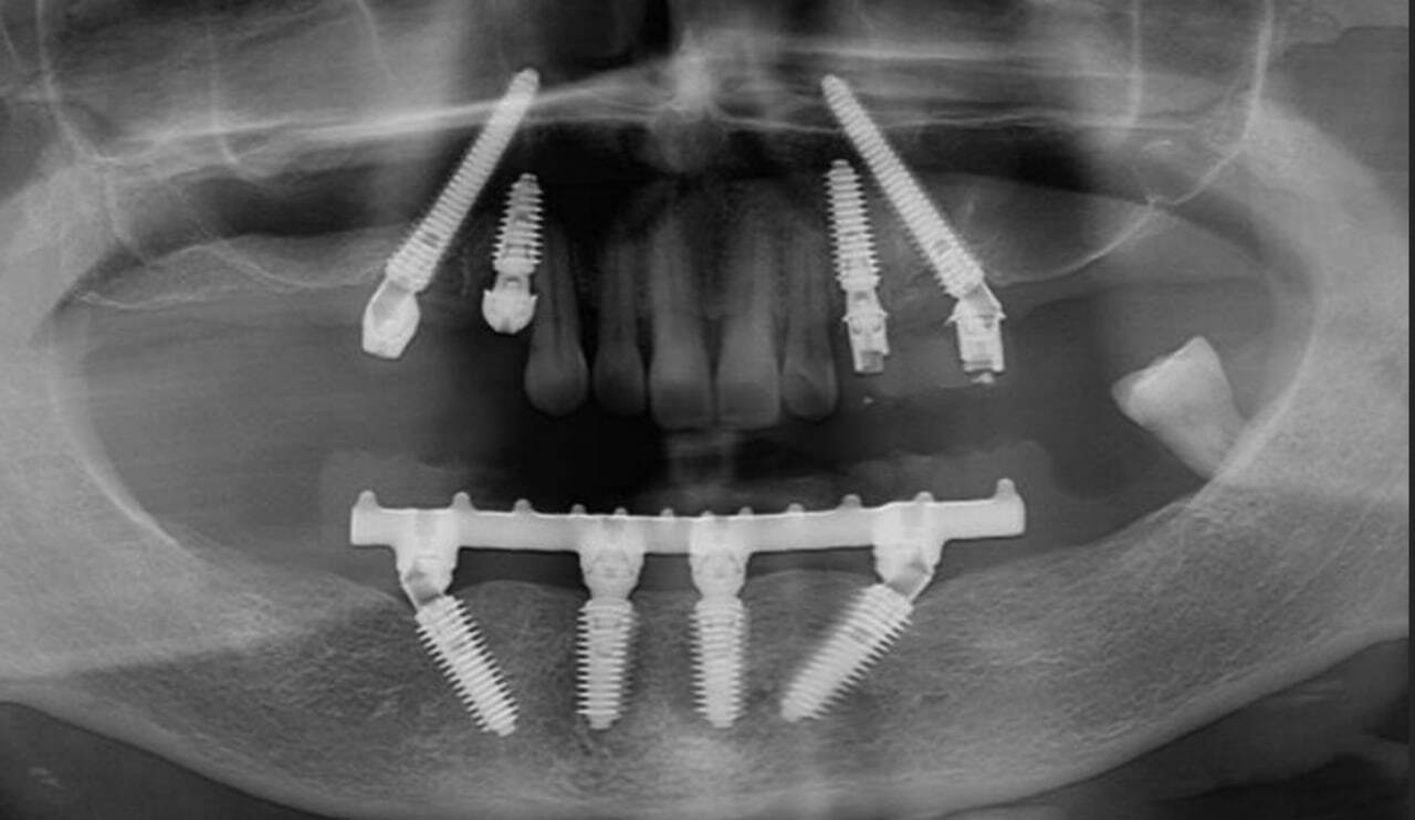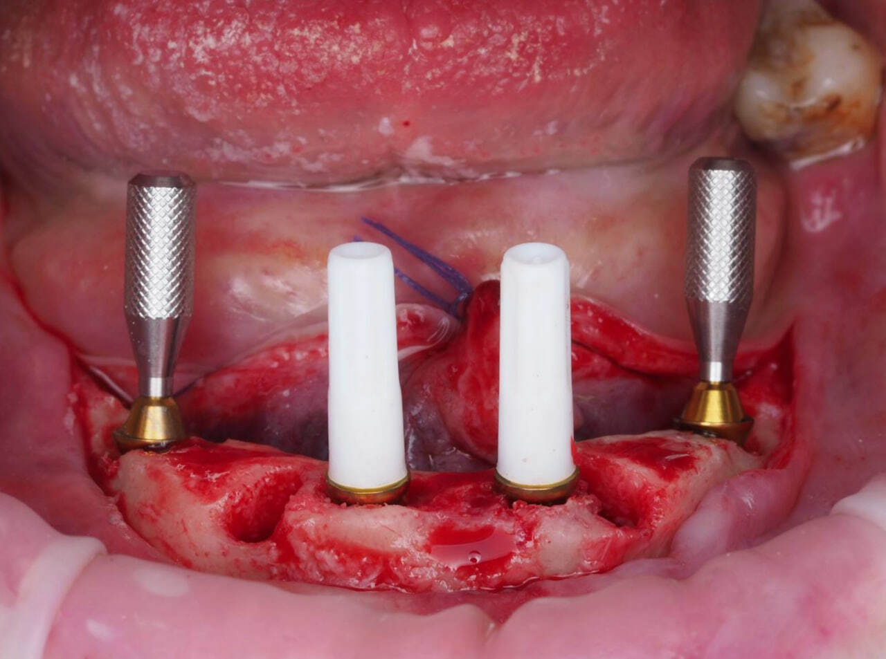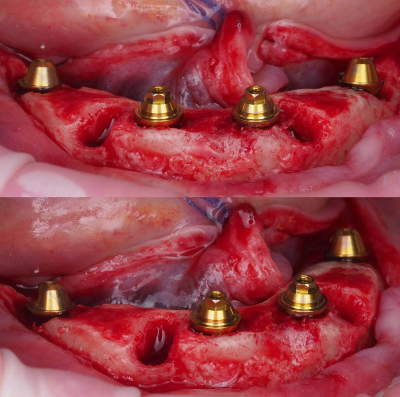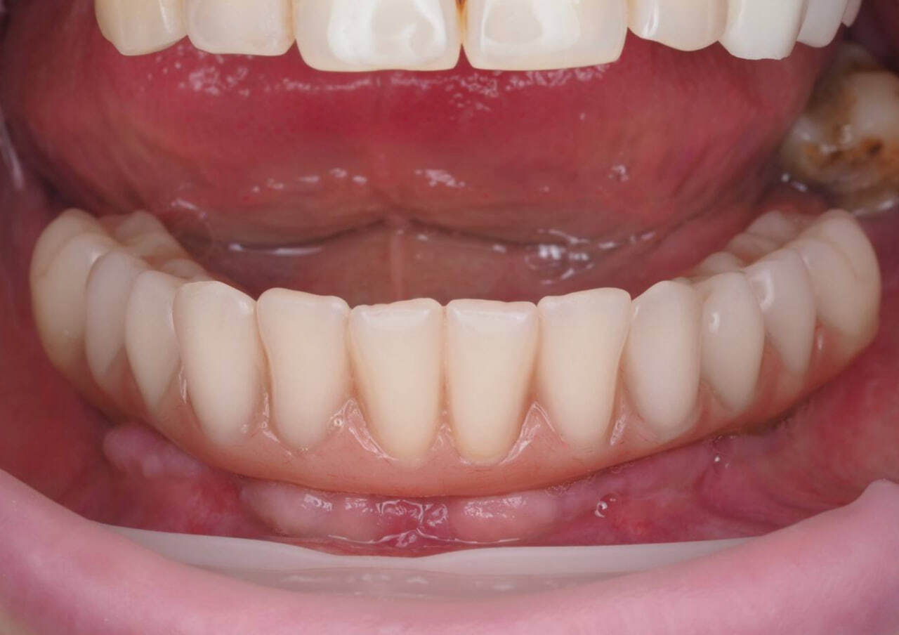 После фиксации временного протеза на верхней челюсти проведена операция на нижней челюсти.
